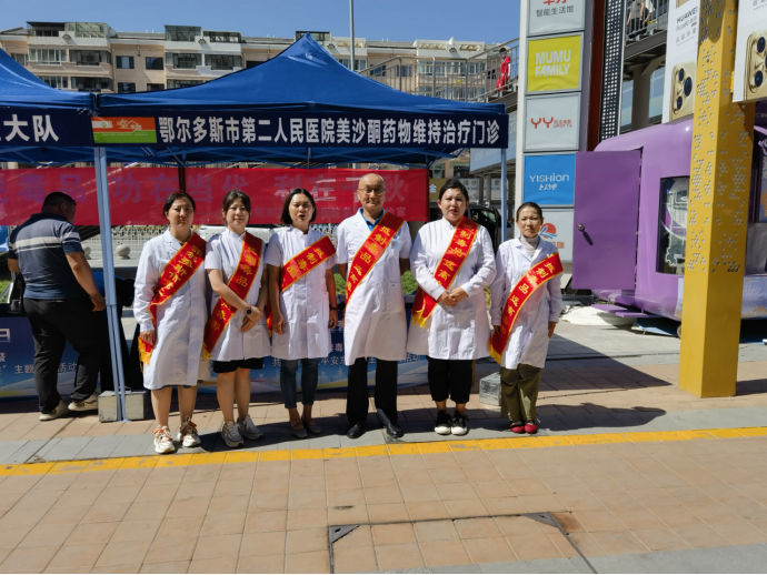 2025年6月26日是第38个“6·26”国际禁毒日,6月21日,鄂尔多斯市第二人民医院组织美沙酮维持治疗门诊医务人员在东胜区万达广场开展以“健康人生,绿色无毒”为主题的禁毒宣传活动。