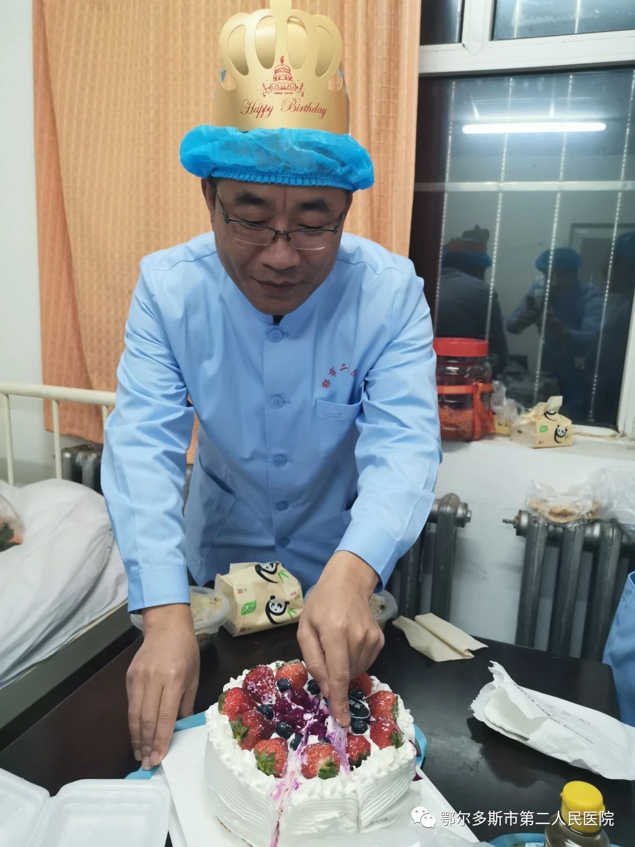 当夜幕降临,隔离病区中的他正在梳理着这一天的工作,“祝你生日快乐,祝你生日快乐”……悠扬的生日快乐歌回响在鄂尔多斯第二人民医院的隔离病区,刘永清院长代表医院全体职工为他送上生日蛋糕,伴随着“战友”们充满祝福的歌声,他许下了生日愿望:为天地立心,为生民立命,为往圣继绝学,为万世开太平,中国加油!武汉加油!鄂尔多斯加油!