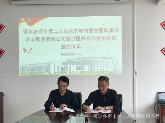 为深入贯彻党的二十届三中全会精神,落实国家卫生健康委、民政部相关工作要求和自治区卫生健康委、民政厅《关于深化医疗卫生机构和养老机构协议合作的通知》,进一步深化医疗卫生机构和养老机构协议合作,加强服务供需对接,为老年人提供优质高效的医养结合服务。2025年3月14日,鄂尔多斯市第二人民医院与内蒙古蒙欣康养养老服务有限公司医养合作服务协议签约仪式在市第二人民医院空港部举行。此次合作按照“平等自愿、就近就便、服务衔接、共谋发展”的原则,以“医养融合、资源共享、服务民生”为核心为老年群体提供全方位、多层次的健康养老服务。