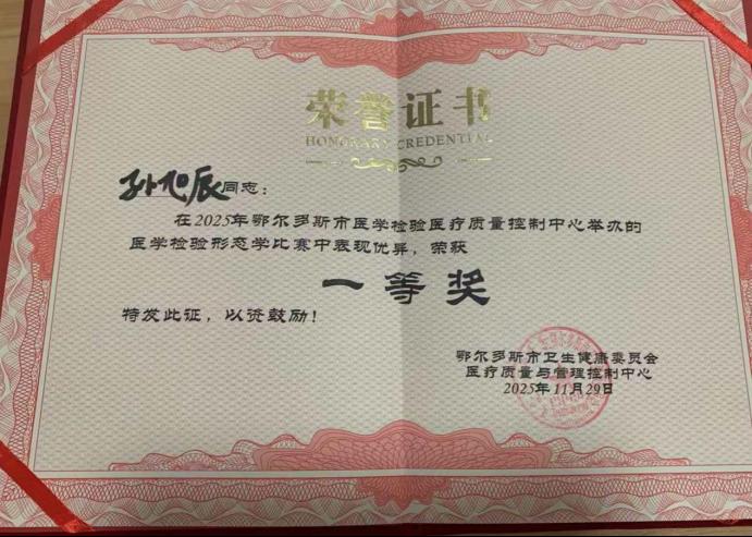 我院医学检验科孙旭辰同志代表医院参赛,凭借扎实的理论基础、敏锐的判断能力和稳定的现场发挥,在比赛中脱颖而出,荣获形态学识别竞赛一等奖。此次比赛以赛促学、以赛验学,充分展现了我院医学检验人员过硬的专业素质和积极进取的精神风貌。市二医院全体干部职工以孙旭辰同志为榜样,学习其钻研业务、精益求精的专业精神,积极提升自身技能水平。
