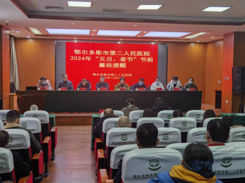 在2024年元旦、春节“双节”来临之际,为深入贯彻落实中央、自治区、市关于廉洁过节的部署要求,持之以恒落实中央八项规定精神,驰而不息纠治“四风”,坚决抵制各种歪风邪气,切实做到持续加压、令行禁止,确保文明过节、节俭过节、廉洁过节,坚决抵制“节日腐败”,营造廉洁文明、风清气正的节日氛围。12月28日,市第二人民医院召开2024年“元旦、春节”节前廉政提醒会议,会议由市第二人民医院党委书记温洁凯主持,全体党政领导班子、各党支部委员、各科室主任(负责人)、护士长、全体党员参加会议。